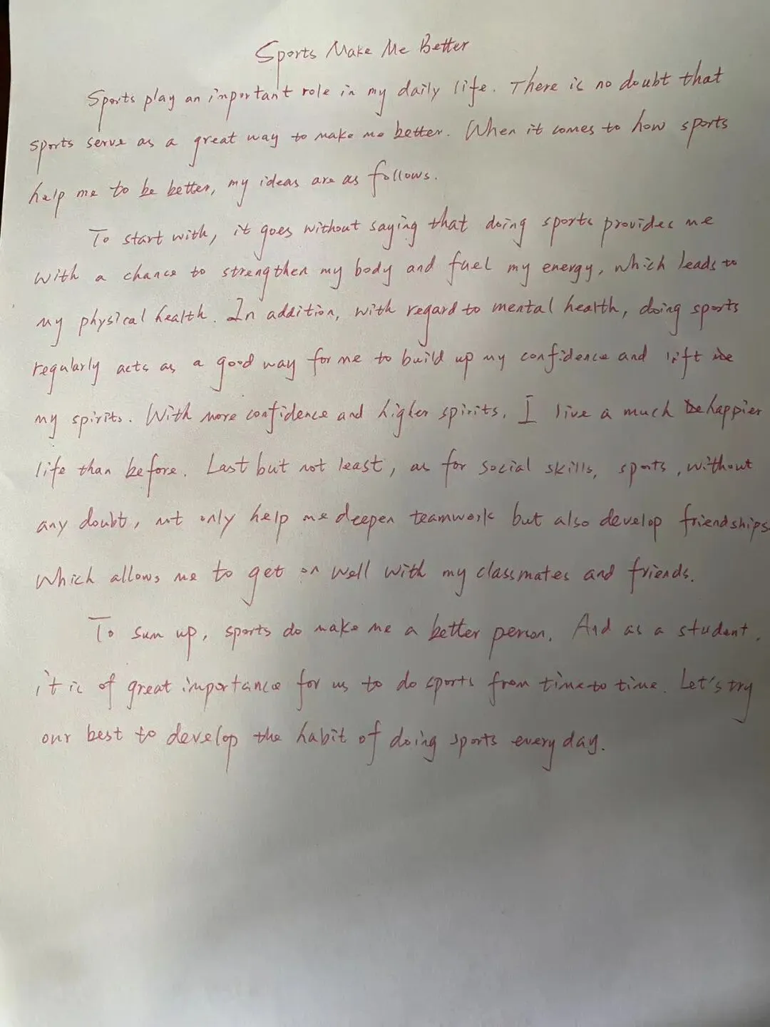 To sum up, sports do make me a better person. And as a student, it is of great importance for us to do sports from time to time. Let’s try our best to develop the habit of doing sports every day.