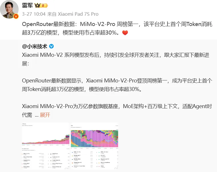 小米自研的MiMo‑V2‑Pro大模型,不仅拿下了平台周榜第一,更交出了一份炸场的成绩单: