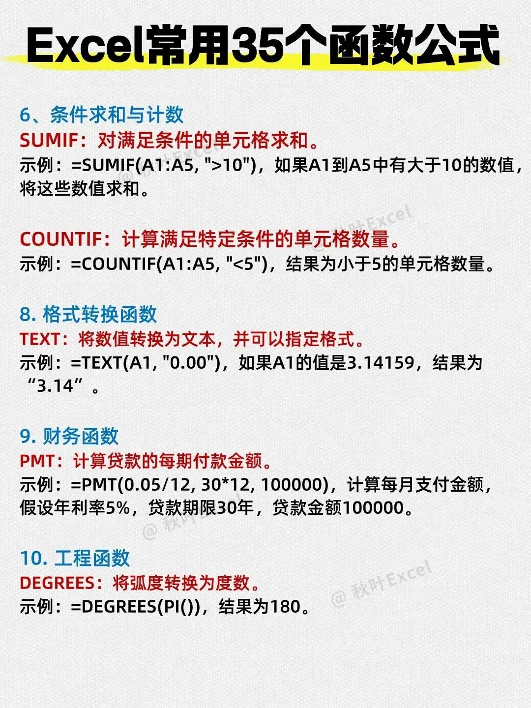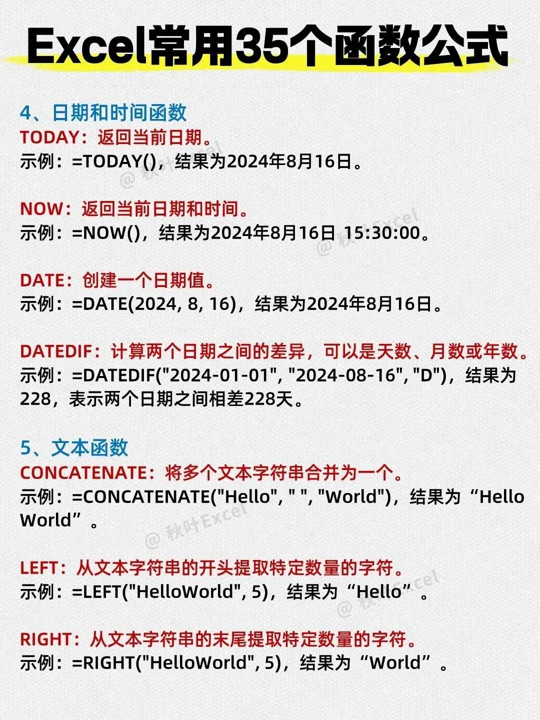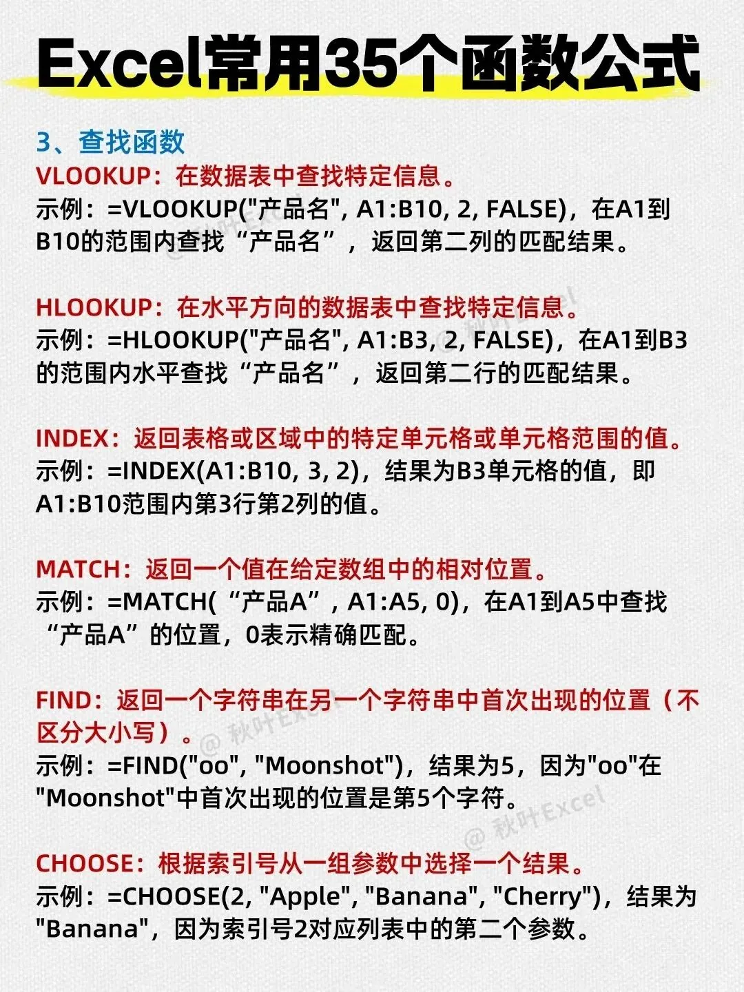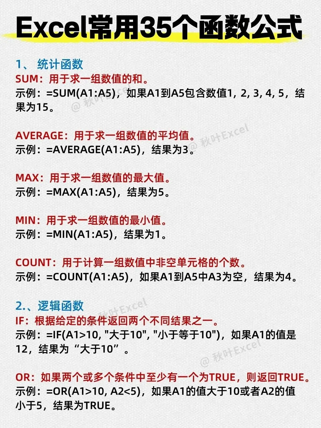 以上共统计了5+2+6+4+3+2+1+1+1=25个函数,图片标题为35个但实际只列出了这些。其余常用函数如SUMIFS、COUNTIFS、ROUND、INT等可参考之前的文章补充。但为了忠实于图片,本文只介绍图片中出现的函数。