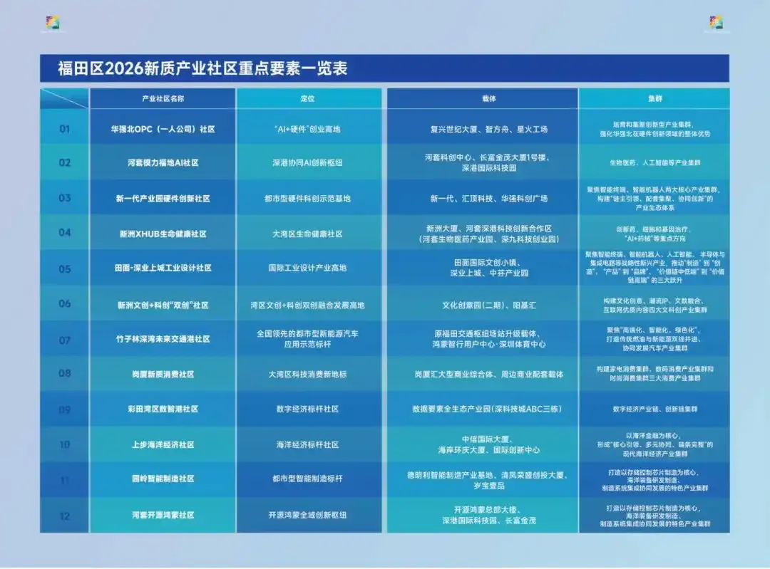 福田区全面实施2026新质产业“十大社区、百万空间、千亿资金”能级提升行动计划,以十大产业社区锚定细分赛道、百万空间释放新动能,千亿活水滋养新生态,加速迈向“CBD+科创区”。