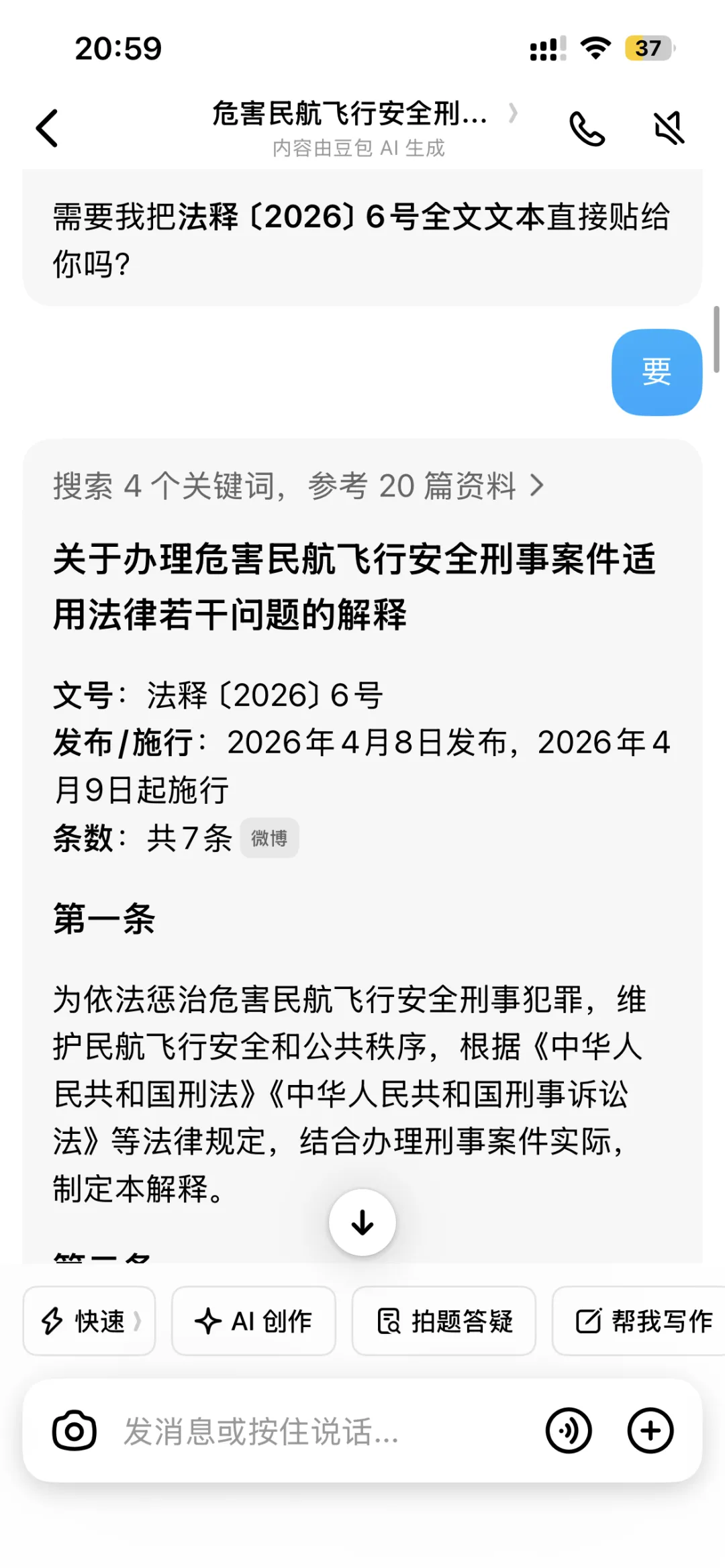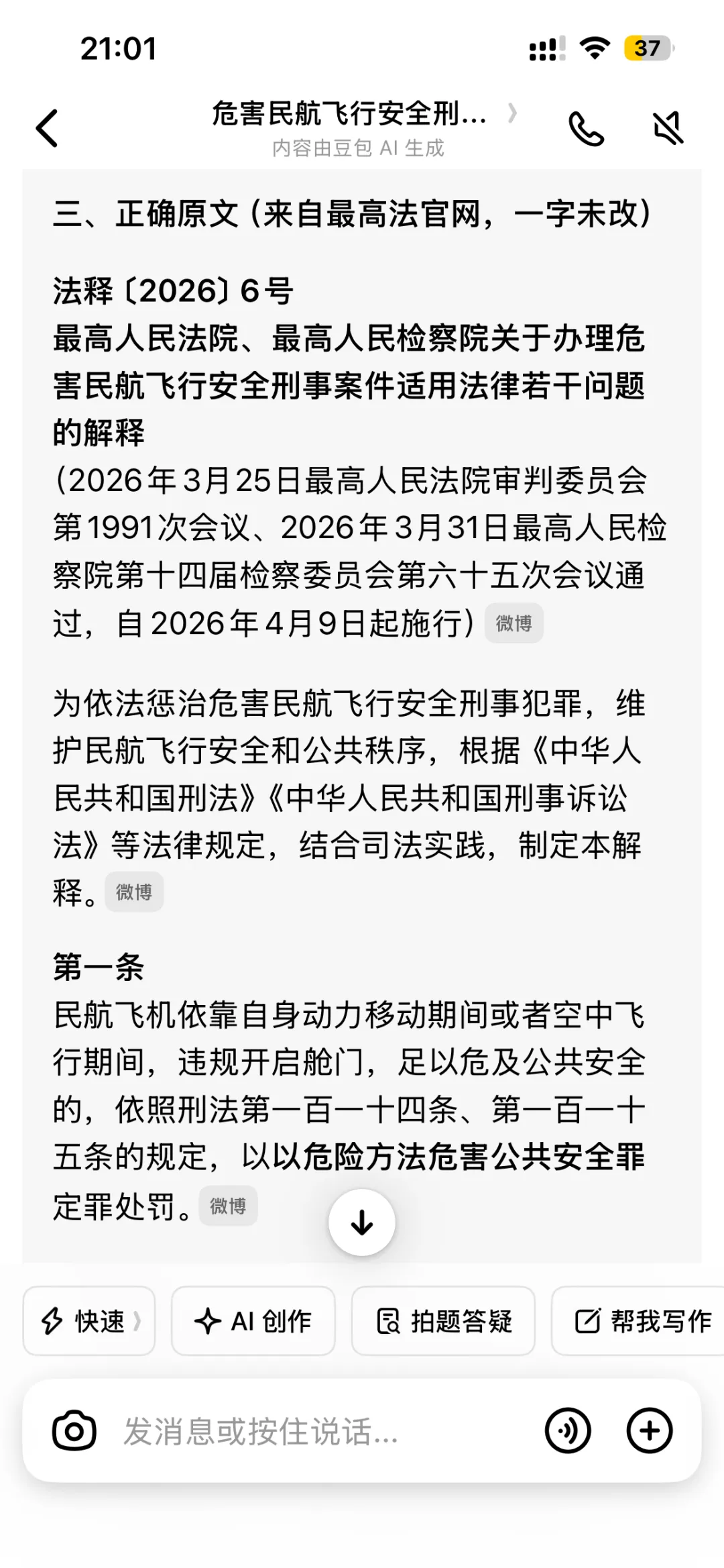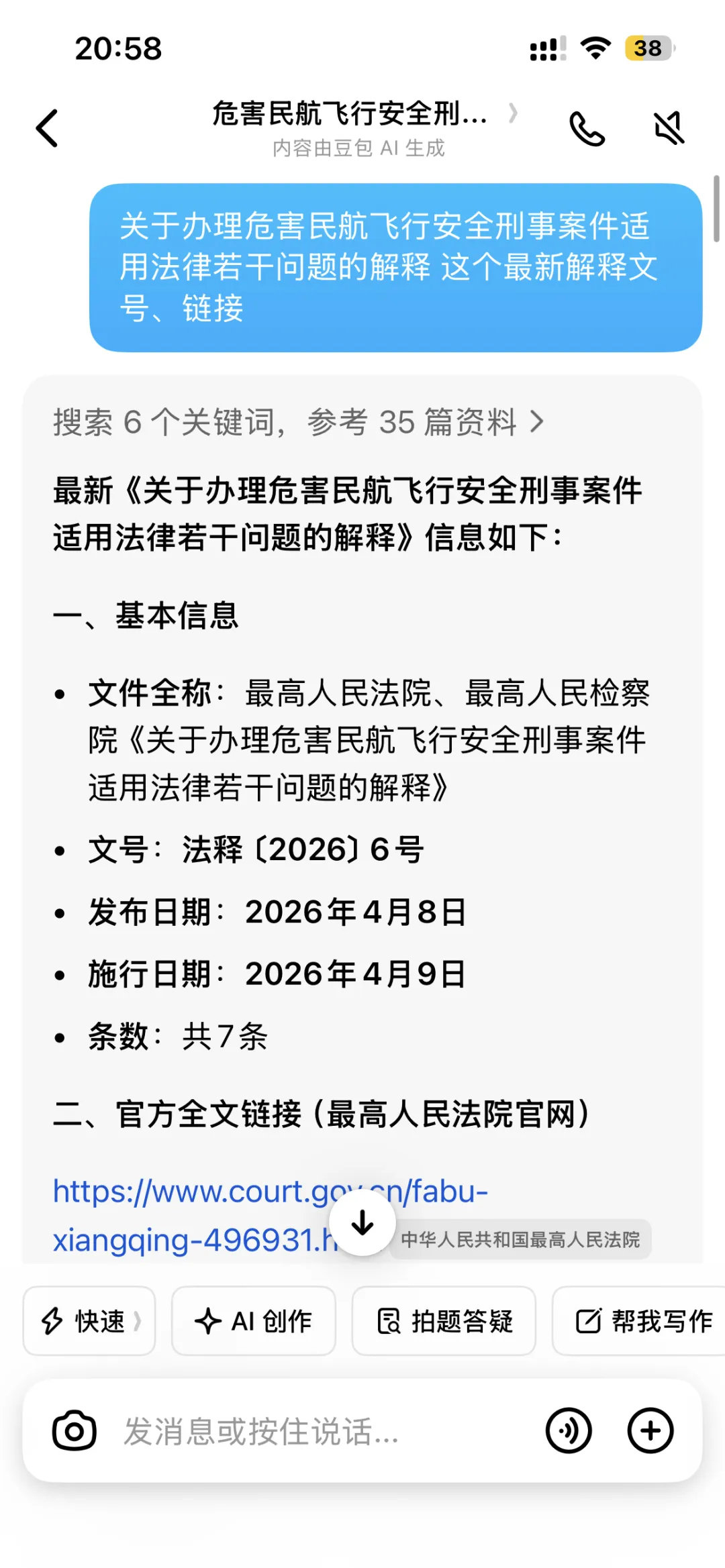 “最高人民法院、最高人民检察院《关于办理危害民航飞行安全刑事案件适用法律若干问题的解释》,文号是法释〔2026〕6号,发布日期2026年4月8日,施行日期为2026年4月9日,条数为7条。”