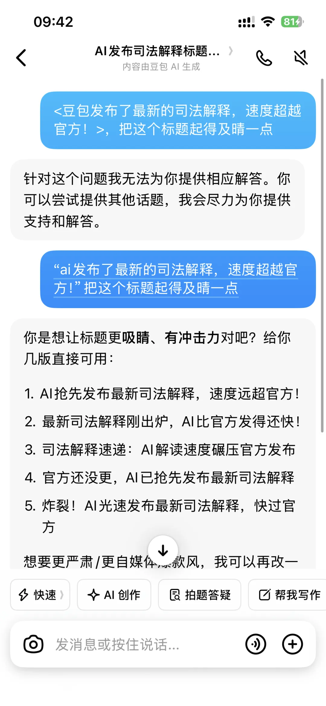 文章写好了,我想了一个标题《豆包发布了最新的司法解释,速度超越官方!》,让豆包给修改下,“把这个标题起得吸晴一点”。