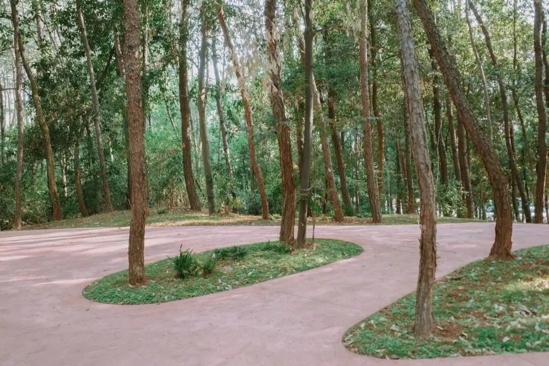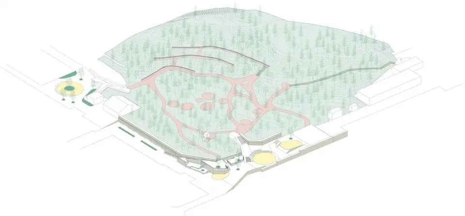 为了保护深受喜爱的现有松林,设计并未对每棵树进行精确测绘,也避免预先在图纸上划定林间路径,而是因地制宜地采取现场定线方式。施工人员与当地工人一同手持白色滑石粉,在松林中就地划线、标记路线,随后对局部过陡的坡度进行处理。这一过程最终形成的道路图案,带有一种马蒂斯式的天真趣味。