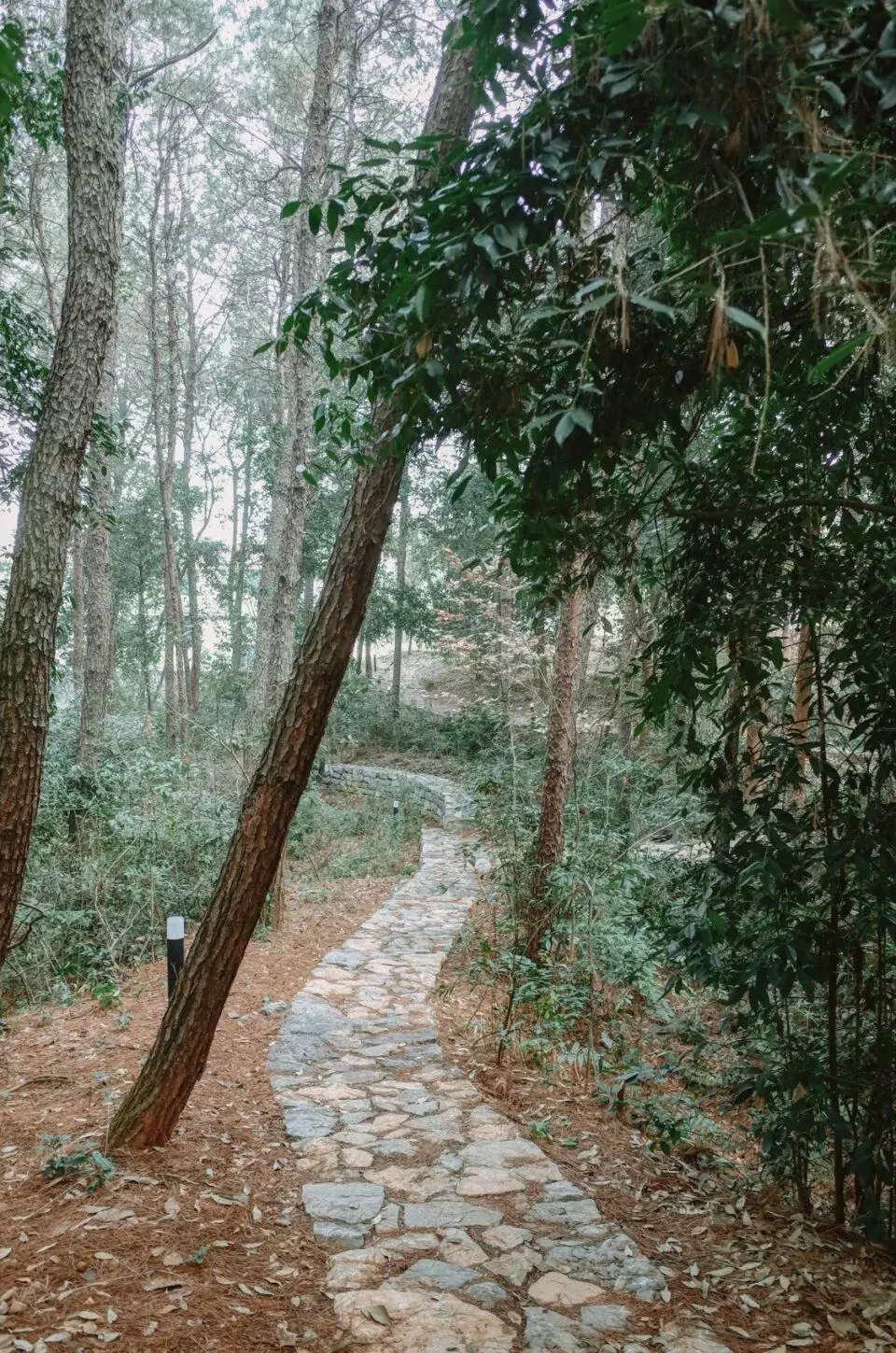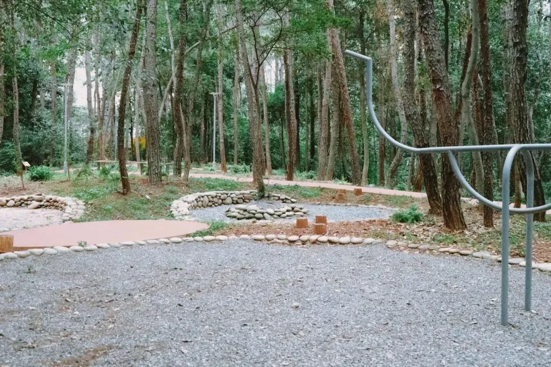 松林内部,散落的斑块状碎石铺地与生态素土铺地并不指向明确的路径,而是意在强化漫游感与探索感。线性矮墙勾勒出山丘地势的起伏,浅色线条在林中若隐若现,也为场地提供了方向感。由于天然马尾松林较为脆弱,易受松材线虫病感染,项目引入了原生马尾松混交林的小苗,调整并建立合理的树种结构,通过增强林下生物多样性,提升松林的抗虫与抗灾能力。