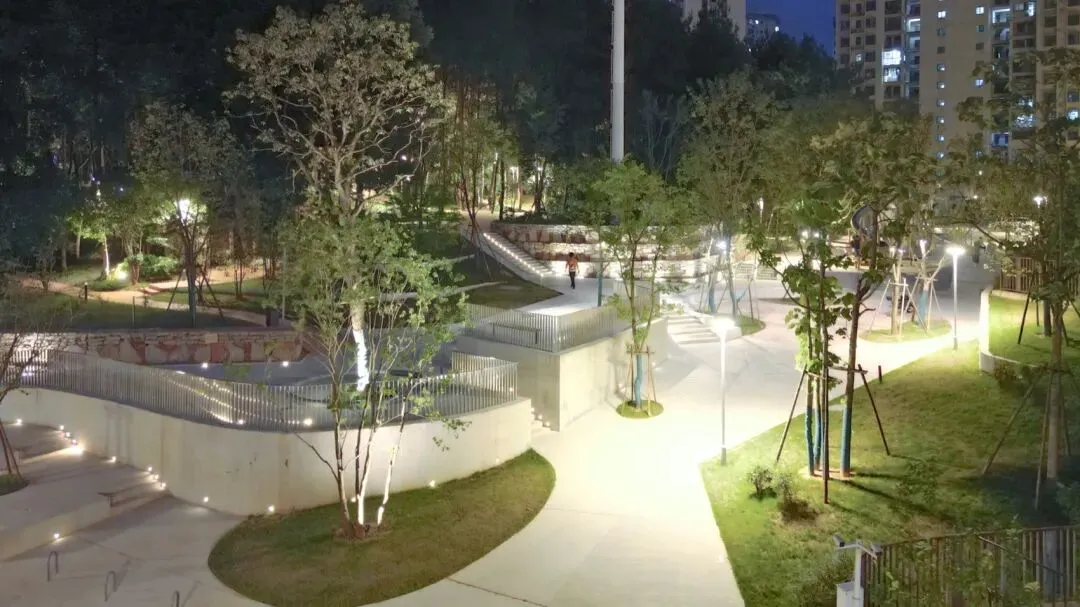 为化解场地内复杂的高差变化,设计利用山丘与建筑之间的空地,在西南侧布置了一系列不断抬升的小广场与运动场地,逐步消化约3米的高差;同时采用回收混凝土块和砖块,以铁丝网包裹制成石笼挡土墙。在两个主要入口处,沿山体设置高低错落的休憩平台,借助地形高差营造视线与动线的交织互动。整体设计旨在为周边社区和学校提供最大程度的包容性,满足不同年龄与背景人群的使用需求,在闹市中打造一个亲切友好、易于亲近自然的聚集场所。公园通过巧妙布置无障碍坡道,为各年龄段市民提供安全、多元的游玩机会,也方便轮椅使用者轻松进入并探索大部分区域。