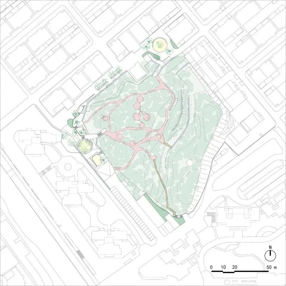 项目位于湖北省咸宁市的市区,北侧紧邻浮山新村,南面是一所包含小学和初中的九年一贯制学校,西侧为高层住宅小区与商业街,山丘上则生长着一片自然演替的马尾松林。当地村民对这片松林怀有深厚情感,明确要求公园在设计与施工过程中不得砍伐山上的松树。与此同时,村民、高层住宅中的城市居民以及学校的学生都将从不同方向进入或穿越这座小公园,新的公共空间因此需要充分兼顾各方使用者的需求。