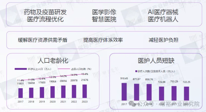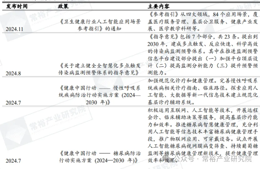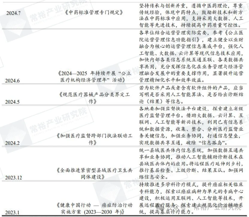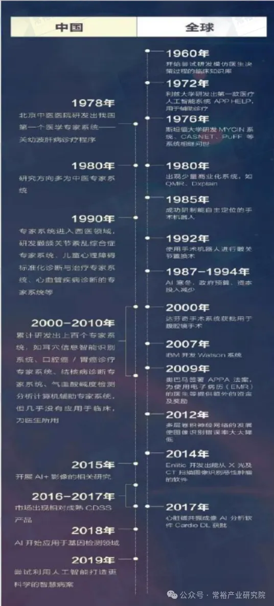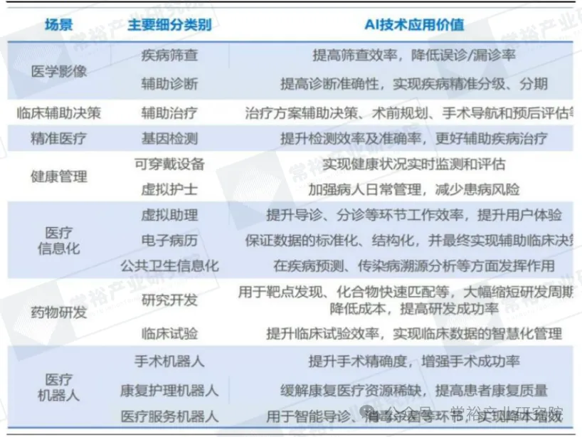产业研究|AI智慧医疗行业研究报告(一)AI智慧医疗行业正从技术验证的“试验田”跨入商业化爆发的“深水区”。全球市场规模2025年约393亿美元,中国市场达1157亿元,预计以10.5%的年复合增长率持续扩张。AI已渗透医学影像、药物研发、临床辅助决策等全链条,国家五部门明确8大方向24项重点应用。研究该产业有助于优化医疗资源配置、缓解供需矛盾;投资该产业可把握千亿级市场增长红利与国产替代机遇;培育该产业能提升我国在全球AI医疗领域的核心竞争力。关键词:AI制药、智慧医院、AI医学影像、AI医学检验、AI健康管理智慧医疗/AI医疗是指通过机器学习、自然语言处理(NLP)、计算机视觉等技术,对医疗数据进行深度分析,辅助临床决策、优化诊疗流程、提升医疗效率的智能化应用体系。AI医疗是利用人工智能技术来帮助医生和医疗机构更快、更好地处理医疗数据、诊断疾病、管理患者健康等。AI可以通过深度学习和分析大量的医学影像、病历数据、基因信息等资料,在此基础上提供更精准的诊断和治疗方案。AI医疗核心技术包括医学影像分析、自然语言处理、机器学习等,例如谷歌旗下的DeepMind公司开发的AI系统,已经在眼科疾病诊断中表现出色,能够通过分析眼底扫描图像,准确诊断出糖尿病视网膜病变等疾病。 AI在医疗中的应用非常广泛,主要包括辅助诊断、临床决策、健康管理、药物研发以及医疗机器人等。通过在这些场景应用AI,可以帮助实现降低成本、提高效率,同时优化病人体验、提高诊疗质量、减少潜在疾病等目标,全方位赋能医疗服务的各个环节。AI医疗提高医疗质量和效率。AI在学习速度与能力方面的卓越表现已广为人知。借助AI技术,能够高效地汇聚过往病例及医学知识,并构建相应模型。在此过程中,AI可助力医生更为迅速地处理海量医疗数据,减轻重复性工作负担,使医生得以将更多时间投入到患者治疗环节,同时辅助制定更为规范的治疗方案,降低人为失误的概率。通过远程医疗及智能诊断系统,AI能够促使偏远地区的患者获取与大型医院相当的医疗服务,推动医疗资源实现更为合理的重新分配,进而让更多人受益于高质量的医疗服务。以IBM公司的Watson for Oncology 系统为例,该系统能够通过深度分析海量医学文献以及患者数据, 为癌症患者量身定制个性化治疗方案。这一应用不仅显著节省了医生的时间成本,还有效提升了治疗的精准程度。 AI 医疗解决“看病难、看病贵”的问题。在传统医疗领域,美国耶鲁大学教授William Kissick 曾提出一个广为人知的理论——“不可能三角”。该理论核心观点为,医疗服务的质量、价格以及就诊速度这三个关键要素,在实际情境中往往难以同时兼顾。 然而,人工智能的兴起,为突破这一“不可能三角”带来了曙光。AI 技术能够助力医疗机构优化患者管理流程,大幅缩短患者排队等候时间。经过充分数据学习训练的AI 系统,其诊疗能力可达到甚至超越具有10 年以上临床经验医生的水平。与此同时,AI 在药物研发进程中亦能发挥关键作用,可显著压缩研发周期,这不仅有效降低了研发成本,还减轻了患者的用药经济负担,有力推动了药物的广泛普及。AI 凭借对患者个体基因数据、既往病史详情以及生活习惯特征等多源信息的深度挖掘与整合分析,能够精准构建契合个体特质的治疗策略。这种基于精准医学理念的个性化治疗模式,不仅显著提升治疗效果, 还能有效规避因传统经验性治疗导致的不必要药物不良反应。以美国23andMe 公司为例,该公司借助先进的基因检测技术,结合AI算法对海量基因数据进行深度剖析,帮助用户精准评估自身罹患遗传疾病的潜在风险,并据此提供科学、个性化的健康管理建议,为疾病预防与早期干预提供有力支撑。提高诊断准确性:AI能够对海量医疗数据进行学习和分析,发现人类难以察觉的规律和模式,减少误诊和漏诊的发生。提升医疗效率:自动化的流程和决策支持系统可以替代或辅助人工操作,如数据分析、病历管理、患者监护等,使医生能够将更多时间和精力集中在患者的治疗上,提高医疗服务的整体效率。加速药物研发:AI技术可以模拟化学反应和分子结构,预测药物的效果和副作用,大大节省了药物研发过程中的实验和临床试验时间,加快新药上市的速度。实现个性化医疗:通过对个体的全面健康数据分析,为患者量身定制个性化的治疗方案,提高治疗的有效性和安全性。从国内AI医疗发展历程来看,自2018年开始,我国人工智能医疗行业监管政策逐步完善,个别赛道开始出现可行性强的商业模式。2021年7月,国家药监局发布《人工智能医用软件产品分类界定指导原则》,明确人工智能医用软件产品按照第三类医疗器械管理。 特点:医疗数据孤岛林立、数据治理有待展开,临床AI应用稀缺。 技术:此阶段的AI医疗产品以辅助医生诊疗的程序或系统为主,几乎没有应用于临床,整体产业仅出现一个初步的形态。 特点:数据建设初步展开,部分疾病标准数据库建立、基于深度学习的感知智能应用兴起。 技术:医疗大数据建设展开,信息系统升级改造,眼底与肺部影像的标准数据库建立;基于深度学习的影像应用走到感知应用发展的前端,NLP、KG等其他应用在慢跑;商业模式处于混沌的初步尝试阶段,可行模式未确定。 特点:医疗数据互联互通建设进一步展开、感知应用算法迭代、应用横纵