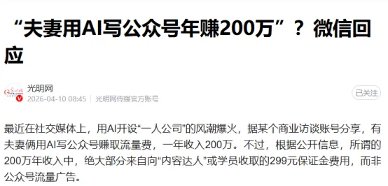 微信重拳整治AI全自动写作:别让算法,取代内容的温度最近,“AI一人公司”在社交平台彻底刷屏,一对夫妻靠AI写公众号年入200万的说法,更是掀起了全网热议。可看似光鲜的赚钱神话,背后早已变味:所谓的高额收入,并非来自公众号流量广告,大多是靠收取学员保证金得来,而这场AI写作热潮,也终于引来平台的正式监管。4月9日,微信团队明确回应,公众平台严禁利用AI、脚本等自动化工具替代真人完成内容创作、发布,也禁止推广相关教程服务,早已上线的平台运营规范,更是给全自动AI内容划下了不可触碰的红线。素材来源:光明网2026年4月10日发布《微信回应AI写公众号:不得用自动化工具替代真人创作》,信息转自澎湃新闻,源自齐鲁晚报不可否认,AI技术的出现,确实给内容创作带来了全新可能。一键生成文案、快速整合素材、高效优化排版,对于普通创作者来说,能大幅节省时间、提升创作效率,合理借助AI工具辅助打磨内容,本是行业发展的正常趋势。但当AI从“辅助工具”变成“创作主体”,当批量生成、无脑拼接、全自动发布成为常态,内容行业就彻底变了味。那些靠AI一键产出的文章,没有真实的观点表达,没有创作者的独立思考,只是文字的堆砌、信息的搬运,看似高产高质,实则全是没有灵魂的流水线产品。更值得警惕的是,不少人打着“AI轻松赚钱”的旗号,大肆售卖写作教程、收取加盟保证金,把AI写作包装成一夜暴富的捷径,不仅误导了大量想要入行的创作者,更让公众号内容生态充斥着大量低质、重复、同质化的信息,破坏了平台原本的创作环境。微信此次的监管举措,从来不是否定AI技术,而是清晰划清了合理辅助与违规替代的边界。平台鼓励的是真人为主、AI为辅的创作模式,是用技术提升创作效率,而非用算法彻底取代真人;打击的是脱离真人表达、全自动生成内容、批量违规发布,以及借此牟利的教程推广行为。从3月27日平台新增“非真人自动化创作行为”禁令,到如今官方正式发声表态,一系列动作都在传递明确信号:公众号内容生态,始终需要真人的思考、温度与表达,绝不能沦为算法流水线的产物。反观此前爆火的“AI年入200万”神话,本质上就是一场利用信息差、收割新手的流量骗局。真正优质的内容,从来不是靠机器批量复制出来的,而是源于创作者的亲身经历、独立观点和真情实感。读者关注一个公众号,看重的是账号独有的价值、创作者的个人风格,而非千篇一律、毫无辨识度的AI文案。当下,不少创作者陷入了误区,觉得AI写作就是流量密码,能低成本、高产出快速变现,却忽略了内容的核心本质。当满屏都是AI生成的空洞内容,读者必然会失去阅读兴趣,最终受损的,是整个内容行业的生态,是每一个用心创作的自媒体人。微信的严管措施,既是对低质AI内容的清理,也是对原创真人创作者的保护。对于创作者而言,更该认清现实:AI是助力而非主力,与其沉迷全自动写作的捷径,不如沉下心来打磨内容,用真实的观点、优质的输出留住读者,这才是自媒体长久发展的根本。技术的进步,不该成为内容创作的枷锁。我们拥抱AI带来的便利,但更要坚守内容创作的初心。唯有守住真人表达的底线,拒绝算法堆砌的空洞文字,才能让公众号生态回归良性发展,让真正有价值、有温度的内容,被更多人看到。