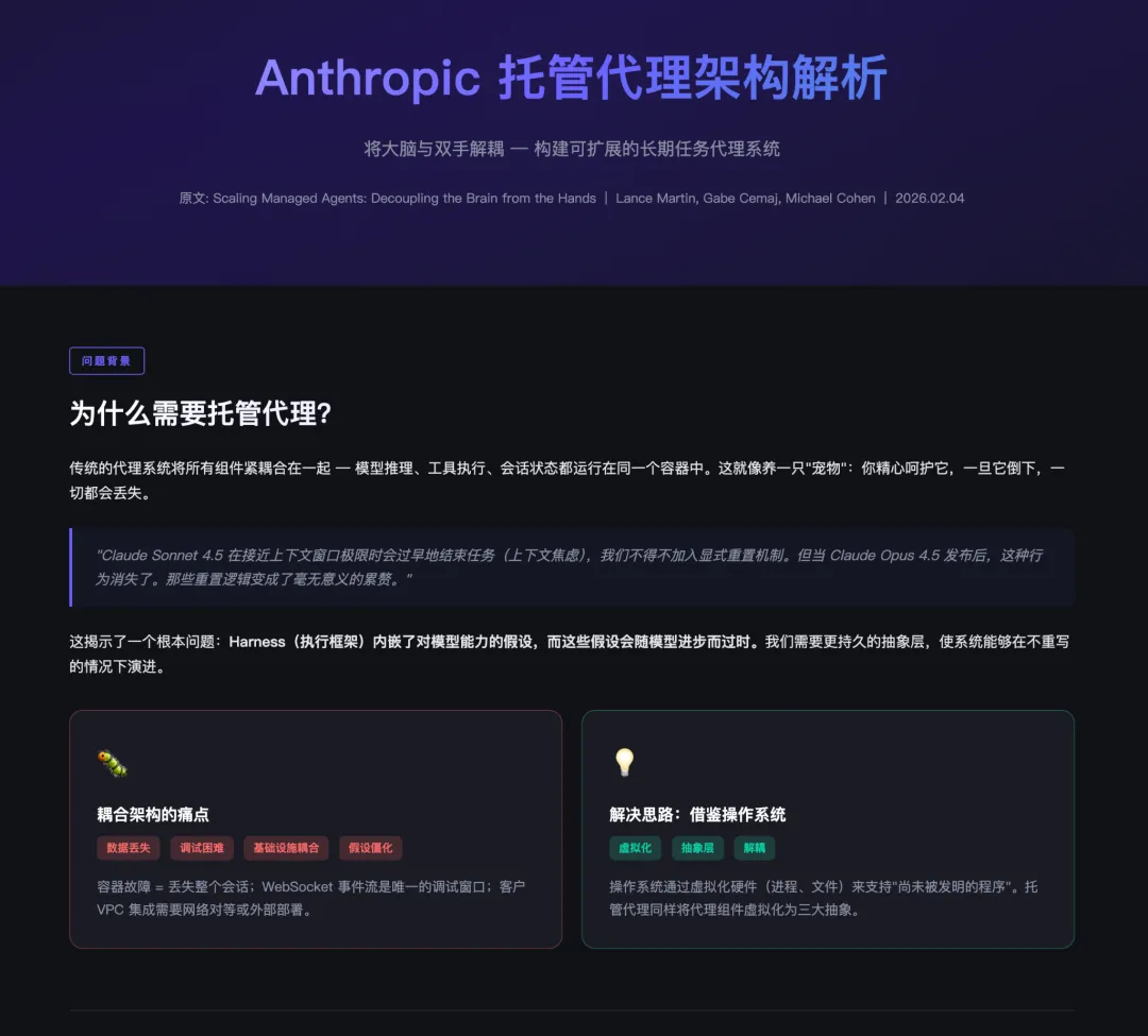 然而这一次,真错了,截止目前,我相信都没有多少人真正看懂了Managed Agents是做什么的,更别说动手尝试了,只是被要把Agent当“牛马”而不是“宠物”的标题党“误导”了。