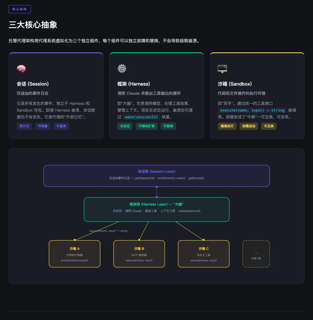 昨天已经发过文章了,并且连夜把自己正在构建的中后台全部按照Managed Agents这本《牲口圈养指南》的想法改造了一遍(我相信这样的速度即使算上硅谷,也是非常快的),尽管我还处在懵懵懂懂的状态,但很明确的知道下面几点: