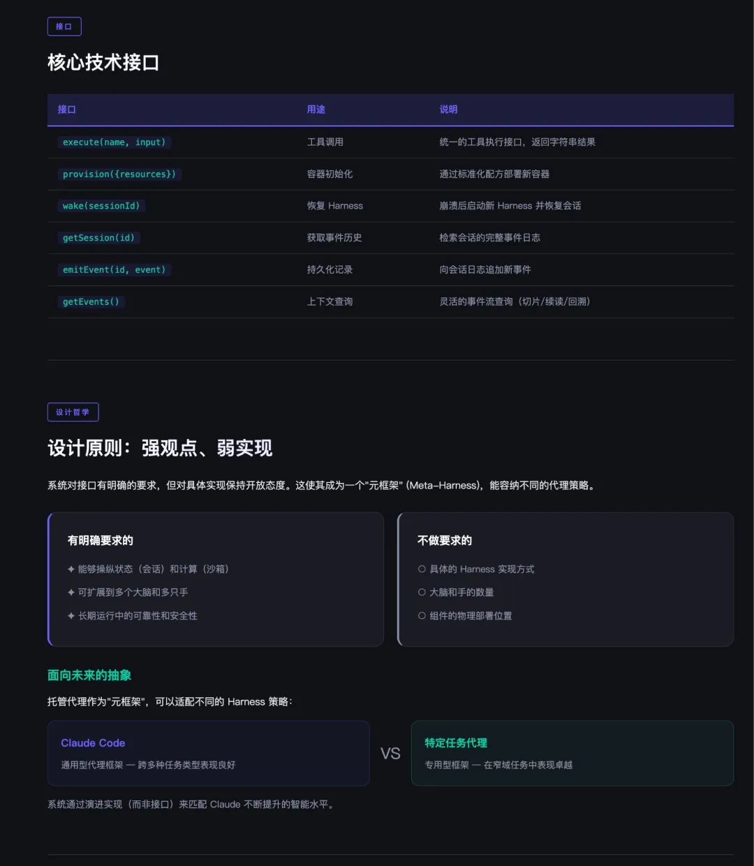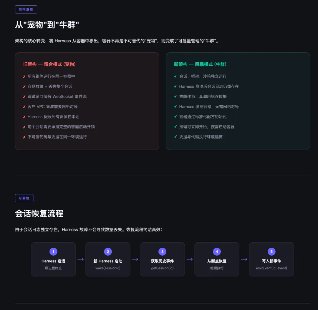 1、Anthropic的核心目标是为了把Harness从Agent运行的环境(容器)里decoupling(解耦)出来,为“AI自主工作”提供足够的机制上的稳定性(robust),所以既被他们称为从“宠物”到“牛群”,也被更高雅的称为将“手脑分离”;