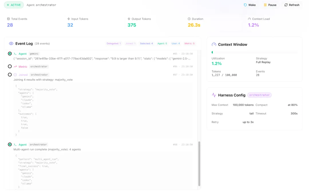 而一个交互上看的更明白的多Agent协作流程:投票回答“9.9大还是9.11大”的执行过程看起来会是下面的样子:简单的Harness在执行容器外,对不同的环境可以适配不同的配置,共享上下文窗口,……。