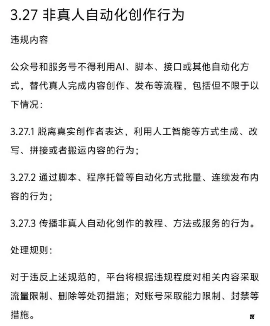 据新浪科技报道,平台在《微信公众平台运营规范》第 3.27 条中,明确划定了非真人自动化创作的违规红线,引发内容创作领域广泛关注。新规清晰界定了三类违规行为:一是脱离真实创作者的表达意图,通过 AI 生成、改写、拼接或搬运内容;二是借助脚本、程序托管等自动化方式,批量、连续发布内容;三是传播非真人自动化创作的教程、方法或服务。这意味着,完全由程序主导的内容生产与发布模式,将不再被平台允许。针对此次规则更新,微信方面回应称,平台始终鼓励真人原创内容,近期注意到部分运营者过度依赖自动化工具替代真人创作,这一行为可能导致内容质量参差不齐,甚至出现同质化、虚假信息等问题,影响平台生态健康。同时,平台也强调,并非完全否定技术工具的作用,支持创作者合理运用 AI 等工具辅助提升工作效率,比如整理素材、优化文字表达,但坚决反对由程序全权负责内容生产的做法。