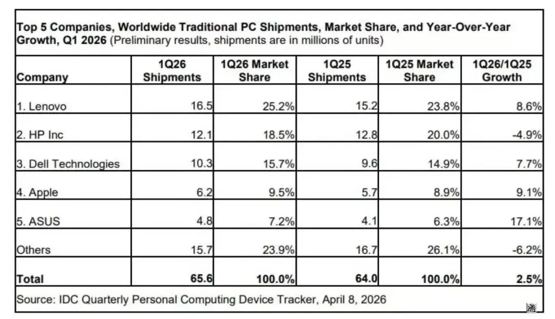 国际数据公司(IDC)发布 2026 年第一季度全球 PC 市场初步追踪数据,数据显示,今年 Q1 全球传统 PC 出货量达 6560 万台,同比增长 2.5%,显著高于 IDC 今年 2 月预测的 6360 万台及同比下滑 0.6% 的预期。首先是零部件涨价预期,不少企业和消费者为规避后续成本上涨风险,提前启动采购计划;其次是 Windows 10 系统的迁移需求,随着该系统停止官方支持,大量用户不得不更换搭载新系统的设备;此外,各大厂商一季度集中推出新品,也有效刺激了市场消费需求。