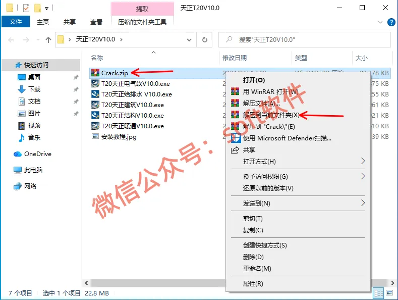 1,右键解压安装包至当前文件夹(注意,解压之前先关闭杀毒软件和window安全中心,避免注册机被删除。)