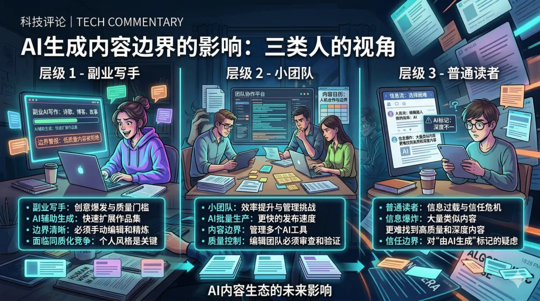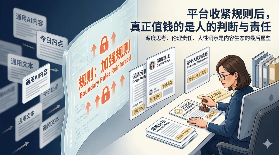 因为 AI 已经从“帮你润色一下”走到了“可以替你搭完整生产线”的阶段。以前的内容工具,大多是辅助型的。你还得自己想题、自己判断信息值不值写、自己决定标题和观点。现在不一样了。很多人已经在尝试让 AI 负责选题、起标题、扩写、配图、排版、分发,甚至连评论区互动都想交给自动化工具。一旦走到这一步,平台面临的就不是“创作者用了没用 AI”的问题,而是“平台上到底还有多少内容能被视为真实表达”的问题。这就是为什么,这件事本质上不是一个“技术进步新闻”,而是一个“平台治理新闻”。而平台治理一旦开始,内容行业里最先被重新定价的,往往不是顶尖作者,而是中间那一大批原本靠信息搬运、形式加工、平台套利活下来的内容生产者。说得更直接一点:以后真正值钱的,可能不再是“你会不会写”,而是以下几件事: