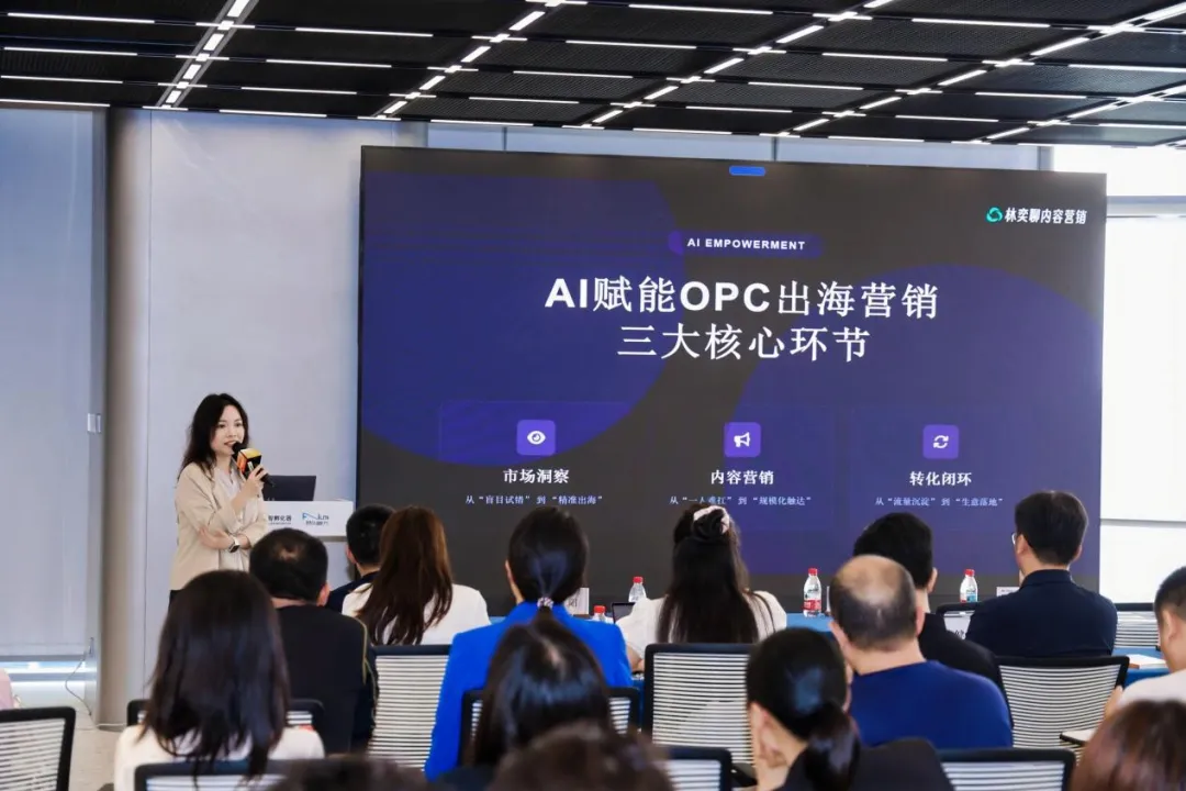 在最后一场主题分享中,开眼内容科技创始人林奕围绕“AI如何赋能OPC出海营销”展开了系统拆解。她将OPC出海营销总结为三大核心环节:市场洞察、内容营销和转化闭环。在她看来,很多团队出海时最容易忽略的,不是内容生产,而是最前端的市场判断。AI在市场洞察阶段的价值,在于帮助团队以更低成本、更高效率判断赛道、客群和需求,减少盲目试错。在内容营销阶段,她提出AI的核心价值,是帮助一人团队跨越语言和文化差异,完成多语言内容生成、平台适配和规模化触达。