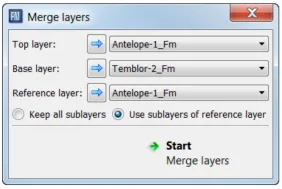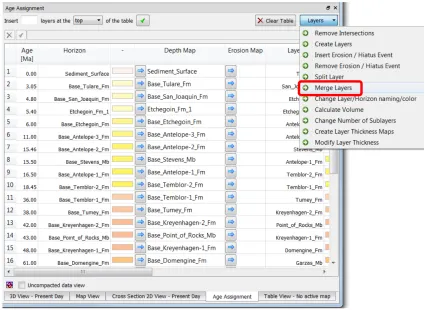 1、在Age Assignment列表中,点击界面右上角的Layers,并选择Merge Layers,打开合并层位的设置界面。也可以选择从Processes=>Layers=>Merge Layer打开界面。2、在Merge Layer的设置界面上,选择想要合并的顶底界面。这时还需要考虑内部细分小层的归属问题,这将影响最终层位内部的相分布特征。选项一:Keep all sublayers