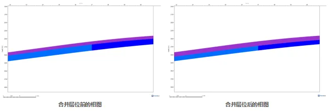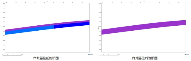 如果使用此选项,合并后的层位的相将分成两部分,下半部分分配为原底部层位的相,上半部分则分配为原顶部层位的相。即在合并层位名称及厚度后基本保持原有相的分布特征。选项二:Use sublayers of reference layer如果使用该选项,合并后的层位的相将统一,下半部分将不会分配为原底部层位的相,而是整个层位的相将与Reference layer中选择的层位的相保持一致。即在合并层位名称及厚度后相的分布特征与所选择的Refenrence layer一致。在我们了解合并层位设置后,就可以根据不同的需要来合并层位,并保持相的分布特征。— END —