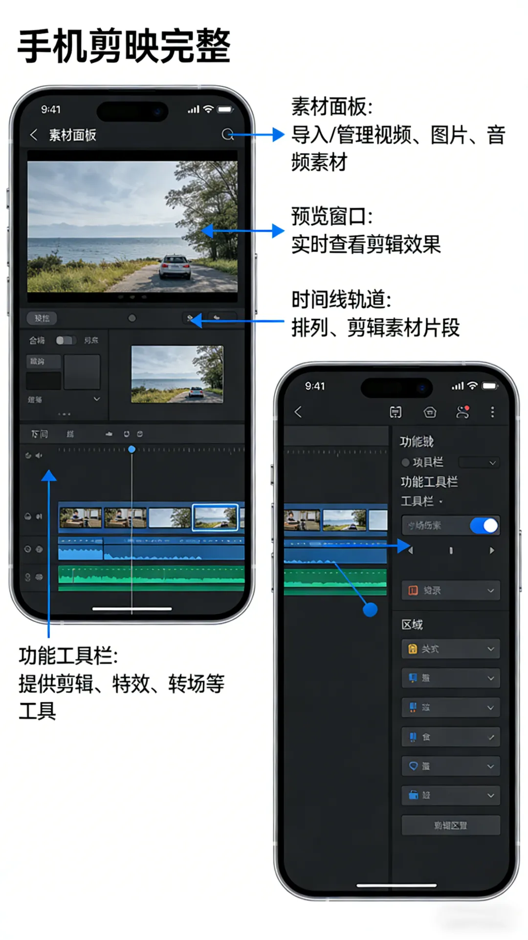 第四个核心区域是功能工具栏,它位于界面的底部,包含了我们剪辑时最常用的所有工具,比如裁剪、分割、转场、字幕、滤镜、音频等。功能工具栏的按钮会根据我们选中的素材类型自动调整,比如选中视频素材时,会显示分割、裁剪、变速等工具;选中音频素材时,会显示音量、降噪、淡入淡出等工具,新手不用记住所有工具的功能,初期重点掌握3个最常用的工具即可:分割、裁剪、删除。