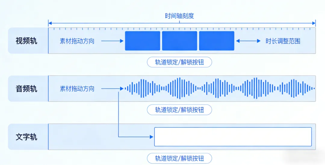 第三个核心区域是时间线轨道,它位于界面的下方,也是剪辑操作的“核心战场”,我们所有的剪辑操作,几乎都是在时间线轨道上完成的。时间线轨道是一个横向的轨道组,默认分为视频轨、音频轨、文字轨,不同类型的素材需要放在对应的轨道上,避免混乱。视频轨主要用于放置视频、图片素材,音频轨用于放置背景音乐、音效、原声,文字轨用于放置字幕、文字特效。