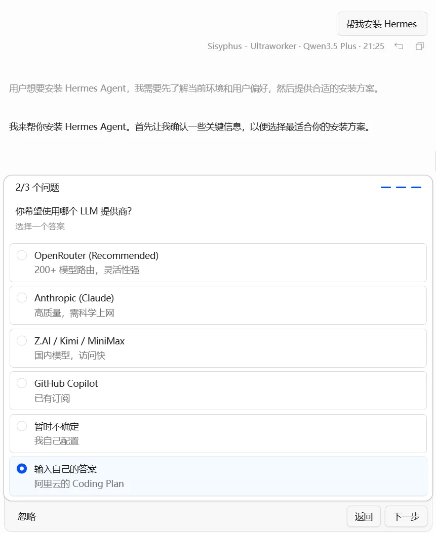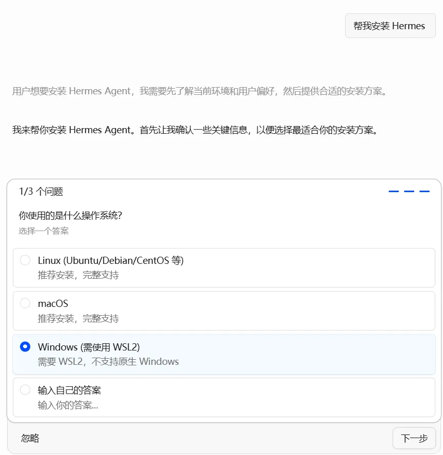 这是最折腾人的问题。我明明在Windows上已经科学上网,但WSL2里的Ubuntu死活连不上GitHub,curl命令一直超时。查了半天发现WSL2默认不继承Windows的代理设置。尝试了配置代理、换镜像站都不太稳定。最后我干脆手动从GitHub下载了hermes-agent的源码包(.zip),放到Windows本机目录下(比如D:\downloads\hermes-agent.zip),然后用OpenCode让它自动处理:我告诉它“源码包在D盘,帮我解压并继续安装”。OpenCode自己通过WSL2路径映射(/mnt/d/downloads/)找到了文件,完成了解压、复制和后续安装。如果你也遇到网络问题,这个办法最省心。