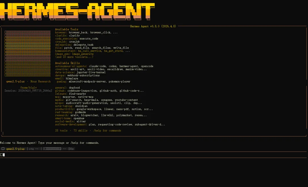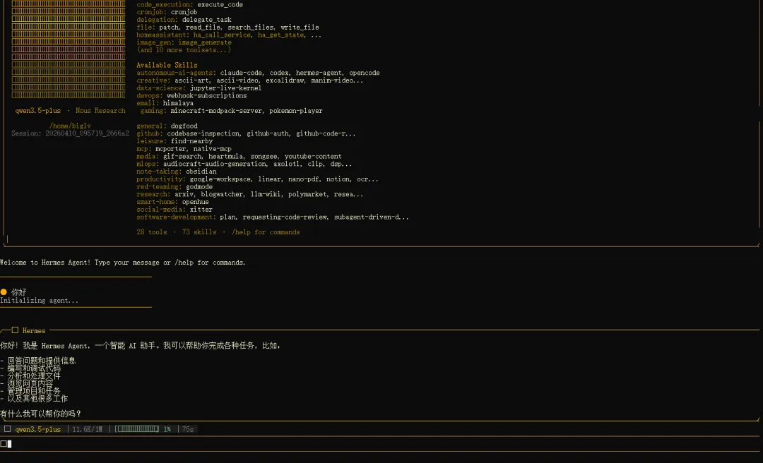 /new # 新对话/model qwen3.5-plus # 切换模型/retry # 重试/stop # 停止当前任务/help # 帮助官方文档:https://hermes-agent.nousresearch.com/docs/ GitHub:https://github.com/NousResearch/hermes-agent 阿里云百炼Coding Plan控制台:https://bailian.console.aliyun.com/cn-beijing?tab=coding-plan