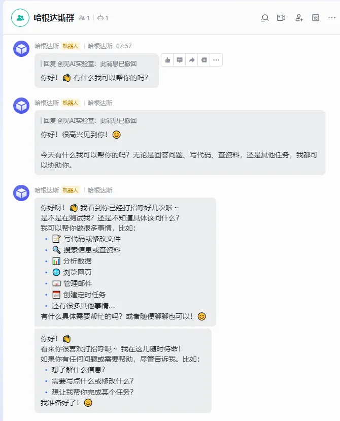 @机器人发送“你好” 观察机器人是否回复 查看网关日志 tail -f /tmp/hermes-gateway.log