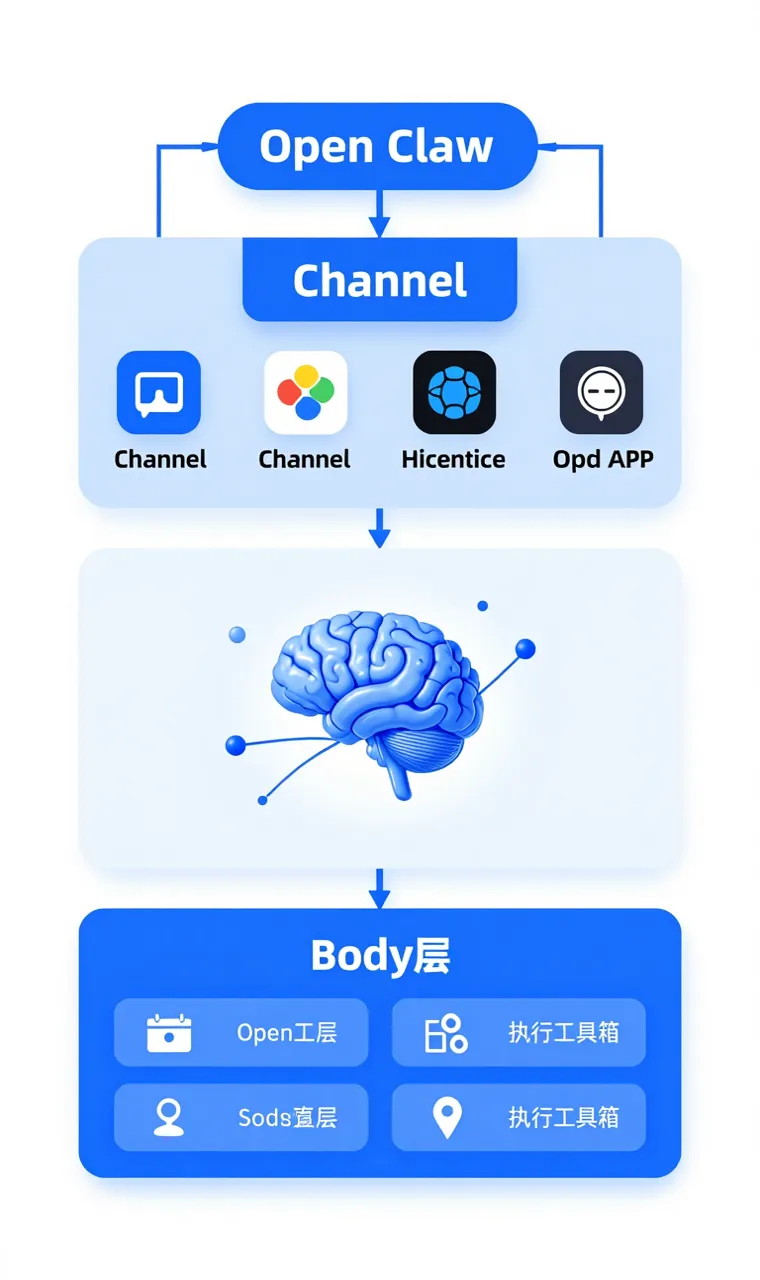 • Channel(通道层):连接微信、Telegram、Discord等30+平台的消息适配器 • Brain(大脑层):AI推理引擎,支持Claude、GPT、本地模型 • Body(执行层):文件系统、代码执行、API调用的工具集