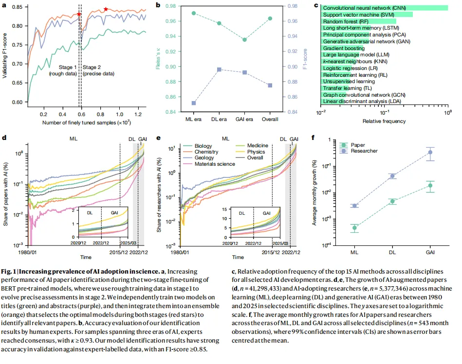 从传统机器学习到深度学习再到生成式AI,三波浪潮下来,AI论文在生物学中的占比涨了51.89倍,采用AI的物理学研究者增长了362.16倍。AI在自然科学中的扩散,早已不是个别领域的偶发事件,而是一场系统性的变革。