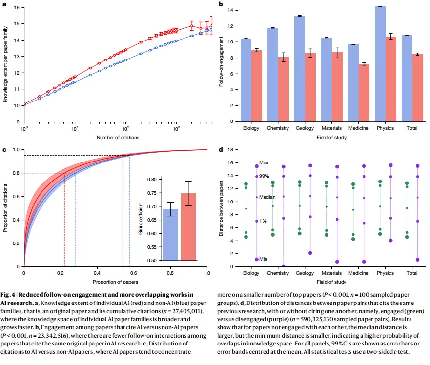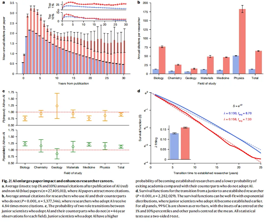 图源:Fig.2a/b,AI与非AI论文引用对比 + 研究者年均引用对比;c/d,初级科学家角色转变概率与生存函数