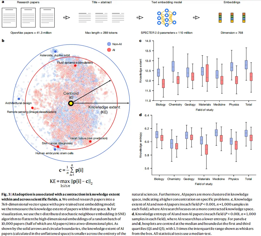 为了衡量科学探索的广度,研究团队用了SPECTER 2.0——一个在大量科学文献上预训练、并用引用信息微调过的文本嵌入模型——把论文投射到768维的向量空间里。在这个空间中,他们定义了一个叫「知识广度」(Knowledge Extent)的指标,本质上就是一批论文在向量空间中覆盖的最大距离,可以理解为这批研究的「知识直径」。