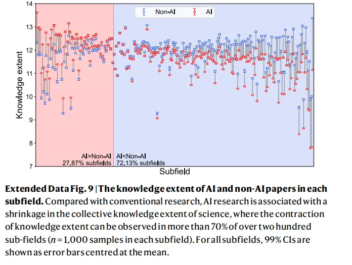 那我们换一个角度看:当论文团队把这六个学科细分为200多个子领域后,超过70%的子领域都观察到了AI研究相比传统研究的知识广度收缩。这不是某个学科的特殊现象,而是几乎遍布自然科学的结构性趋势。