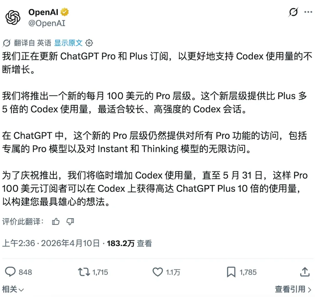 OpenAI 新增 100 美元订阅档位,定位高负载开发者与持续编码场景。该定价位于大众订阅与更高阶企业方案之间,释放出“中高频开发者”正在成为独立商业层的信号。对团队选型来说,后续关注重点将是单位成本下的连续调用稳定性与真实产出效率。