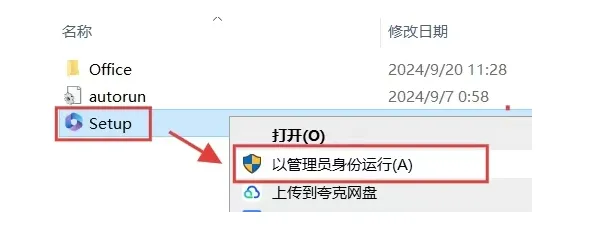 2、打开【setup】文件夹,点击【setup.exe】点击鼠标右键选择【以管理员身份运行】