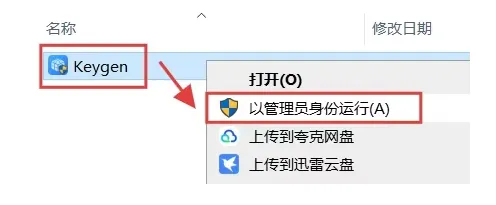 6、点击【Keygen】程序,鼠标右键选择【以管理员身份运行】。(如果打开没有看到有这个程序,是电脑杀毒软件和防火墙拦截删除了,关掉重新解压即可)