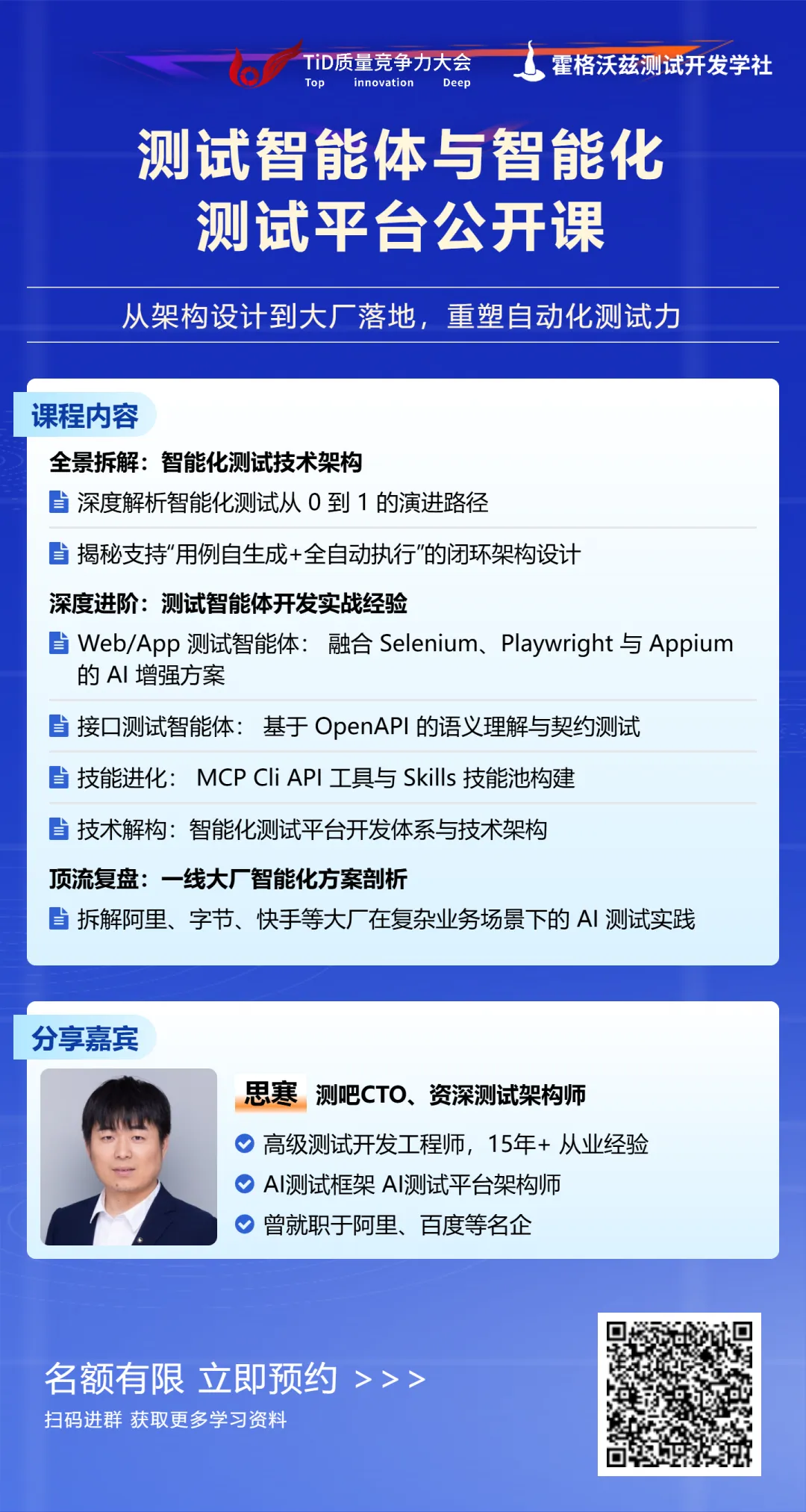 我们关注测试工程能力的系统化建设,包括 Python 自动化测试、Java 自动化测试、Web 与 App 自动化、持续集成与质量体系建设,同时探索 AI 驱动的测试设计、用例生成、自动化执行与质量分析方法,沉淀可复用、可落地的测试开发工程经验。