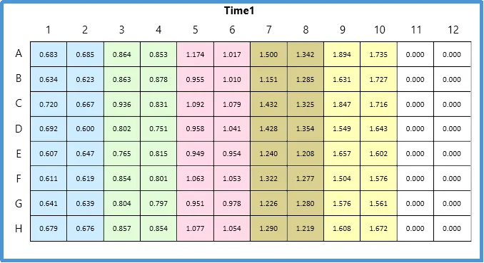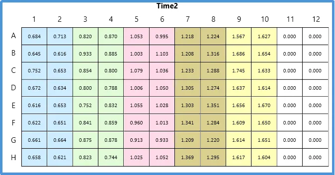 将验证方案二实例的表 5 中的数据分别导入 Time1 板和 Time2 板,然后按照不同效价水平进行分组,如此分组是为了相对准确度分析和精密度方差分析。