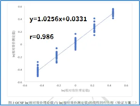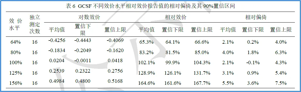 验证方案二实例中相对准确度、精密度和线性均符合要求的效价水平范围为 64%~156%,涵盖了其质量标准范围下限(80%)的 80% 至上限(125%)的 120%。