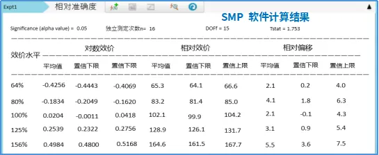 按照新 9401 中相对准确度评价方法项下的计算公式,在 SoftMax Pro 7 软件中计算每个效价水平相对效价报告值的相对偏倚及其 90% 的置信区间。软件中的计算结果与实例中展示的计算结果完全一致。
