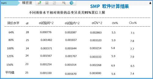 按照新 9401 中精密度评价方法项下计算公式,在 SoftMax Pro 7 软件中计算每个效价水平相对效价的总变异及其 95% 置信上限。软件中的计算结果与实例中展示的计算结果完全一致。