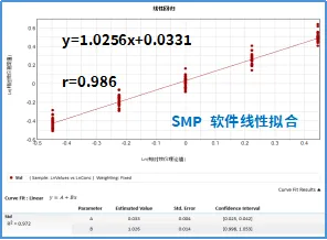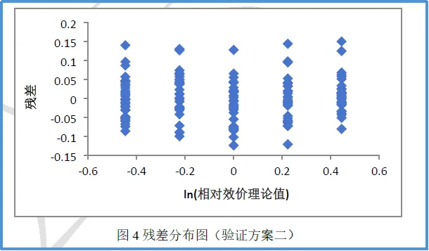 以相对效价理论值的对数(横坐标)对其相应的效价测定值的对数(纵坐标)作图,采用最小二乘法进行线性回归,并以相对效价理论值的对数作横坐标,以各效价水平的残差作纵坐标,做残差图。在 Softmax Pro 7 软件中可直接进行线性回归拟合和残差图,软件的拟合结果和残差图与实例中展示的曲线拟合结果和残差图一致。