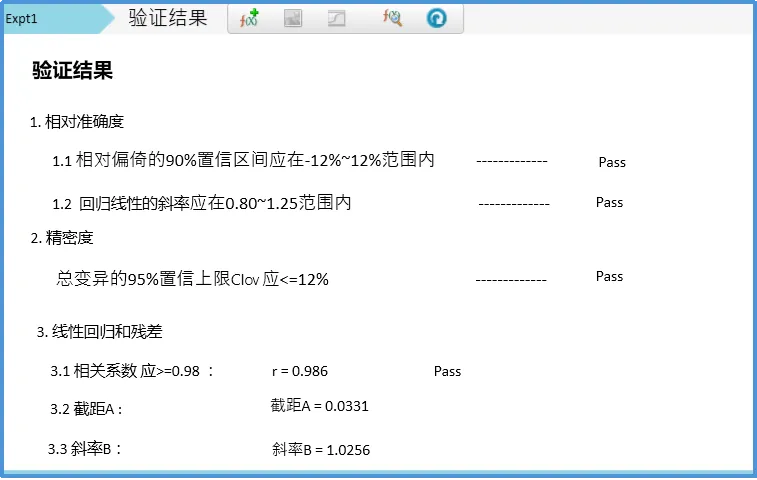 经过上述验证,证明该分析模板是可靠的。我们将相对准确度、精密度、线性及范围 4 个指标的验证结果编辑到一个结果页。使用该分析模板时,可将本结果页的可接受标准修改成产品的实际可接受标准。