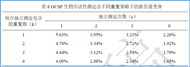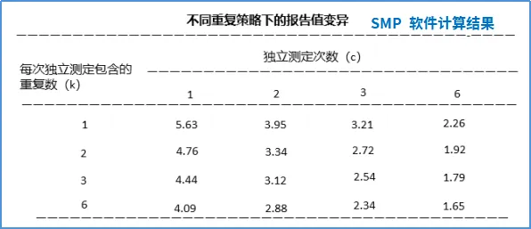 利用方差分析法获得方法的精密度结果,按相应公式计算不同重复策略下报告值变异。软件的计算结果与实例中展示的计算结果完全一致。