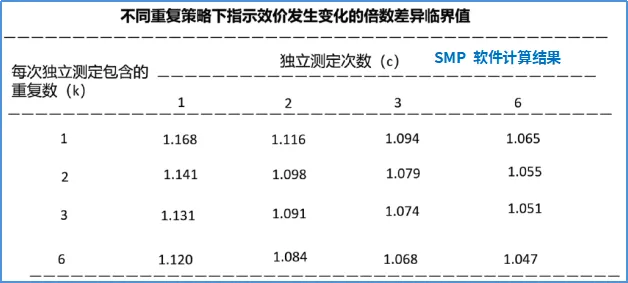 利用方差分析法获得方法的精密度结果,按公式(19)计算不同重复策略下指示效价发生变化的倍数差异临界值。软件的计算结果与实例中展示的计算结果完全一致。
