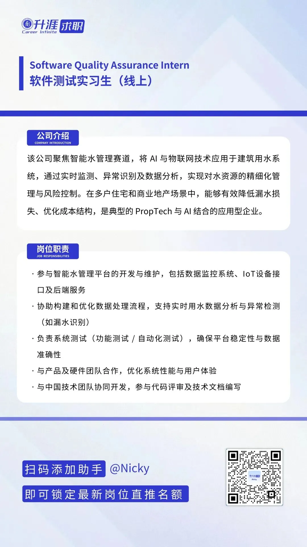实习推荐|诚招软件测试实习生,零经验可投留学生注意!软件测试实习生申请通道开启名企直投+简历优先筛!手慢无👇直击中国留学生海外就业核心痛点!升涯求职集结2000+合作企业、2000+名企精英导师,用96.5%的实战成功率,让你从求职迷茫到斩获心仪Offer,轻松扎根海外职场~