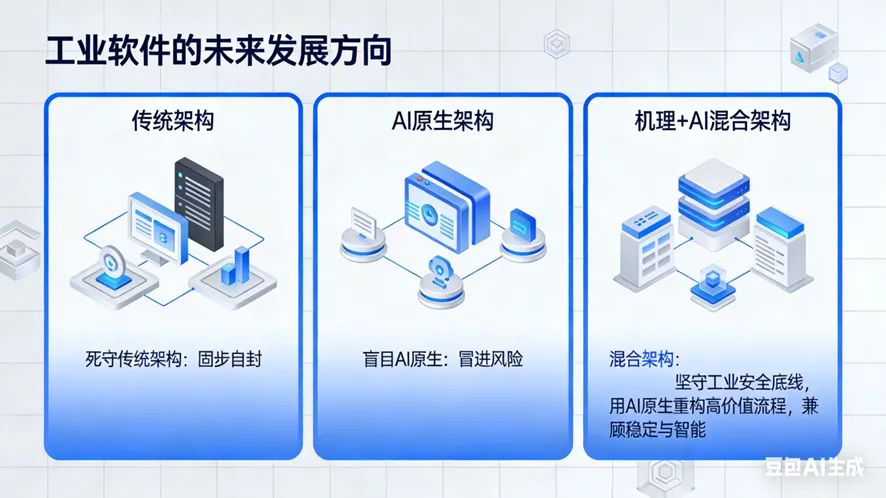 工业软件的未来,既不是死守传统架构固步自封,也不是盲目全盘AI原生冒进,而是坚守工业安全底线,用AI原生重构高价值流程,以机理+AI 混合架构兼顾稳定与智能。