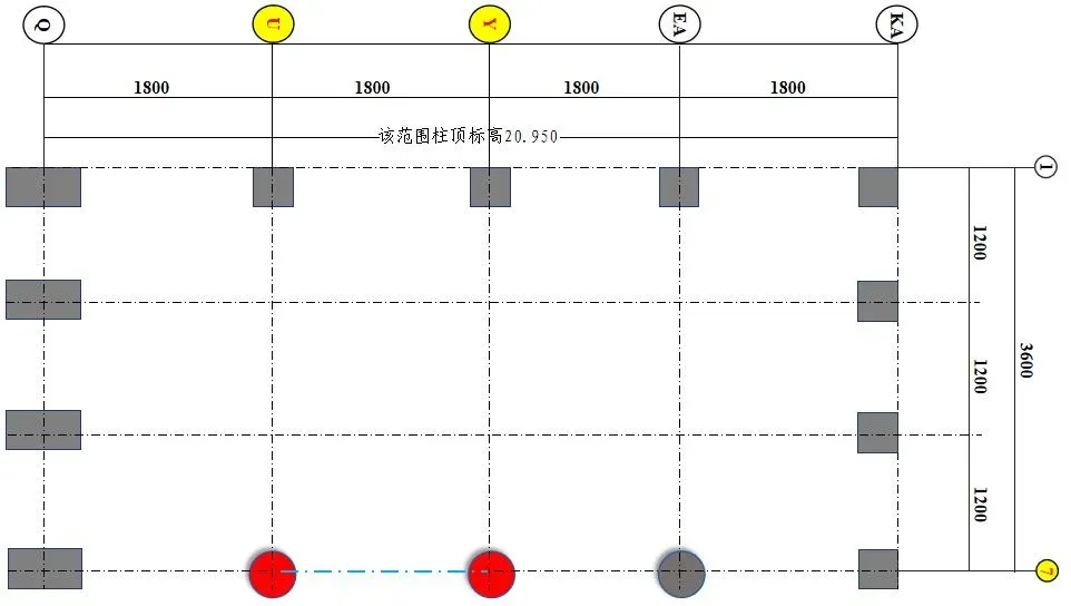 图 2:灰色位置表示现场混凝土立柱,红色位置从左至右为 Q-KA-U/7 立柱、Q-KA-Y/7 立柱,蓝色线段表示模板支撑架体坍塌区域位置