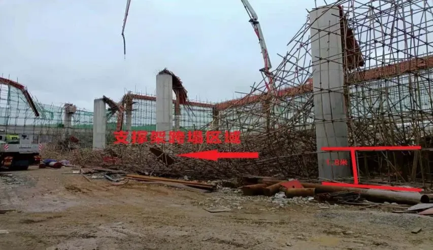 3.模板支撑架体搭设不规范。一是立杆间距与步距违反专项施工方案,多处未按专项施工方案要求搭设,立杆间距达1300mm(方案要求 700mm),步距达 1800mm(方案要求1200mm),大幅降低支撑刚度;二是剪刀撑缺失,未按要求设置竖向、水平剪刀撑(四周及中间 7 跨、顶步 8m 间距),架体抗侧向力能力不足;三是抱柱连接缺失,未按方案每柱每步设置抱柱,导致立杆独立受力;四是高宽比超标未加固,柱、梁模板支撑脚手架高宽比大于 3,未采取增加稳定性措施(如两侧增加钢丝绳缆索),并进行支撑脚手架的抗倾覆验算。