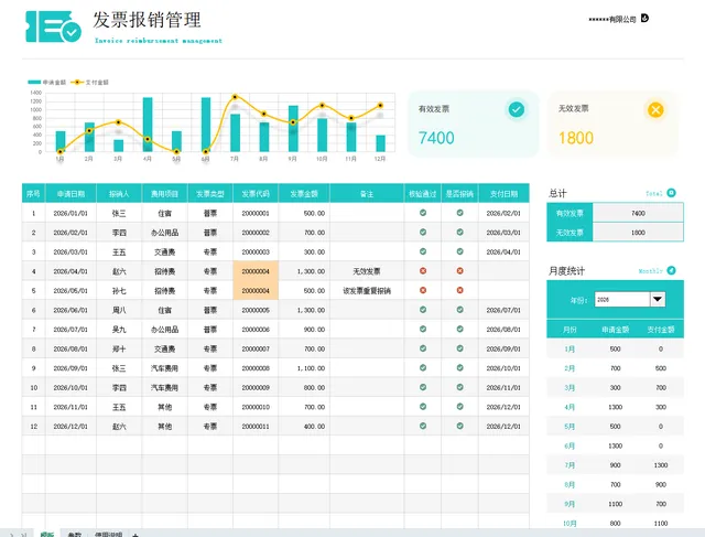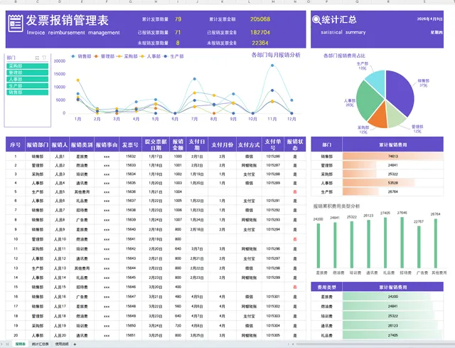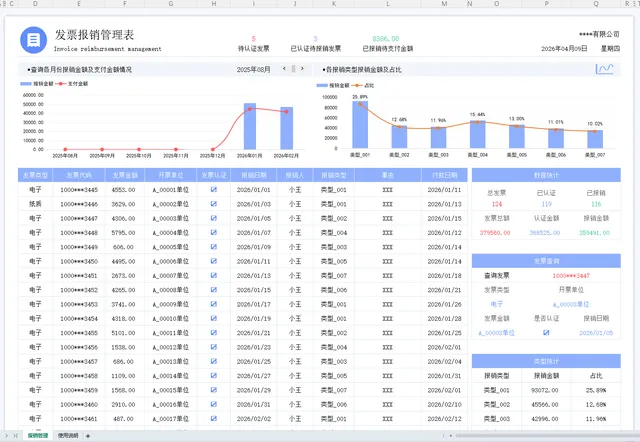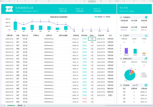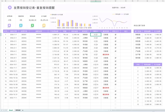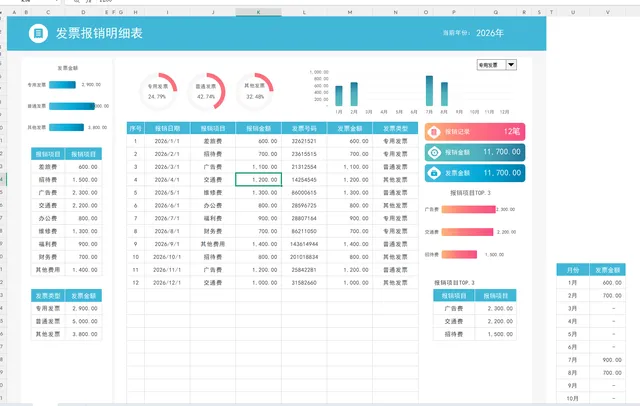 1、只需要登记报销发票登记表,其他数据自动更新。